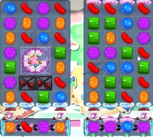 Candy Crush Saga Level 1065’s ingredients are below a jelly cake that takes up a 2x2 square area. This leaves only one column of candies on either side of it, making it nigh impossible to reach the ingredients. With only 15 moves, trying to reach the ingredients first, with this limited space, will well be a waste of moves. In Candy Crush Saga Level 1065, the way to clear the jelly cake is not to go for it head on, as there isn’t too much candy surrounding it either, apart from above it. The only way, therefore, is to play near it as much as possible. Look out especially for opportunities to make matches beside it on both sides. Don’t miss this as it is rare and it makes the way to reach the ingredients below the cake.
